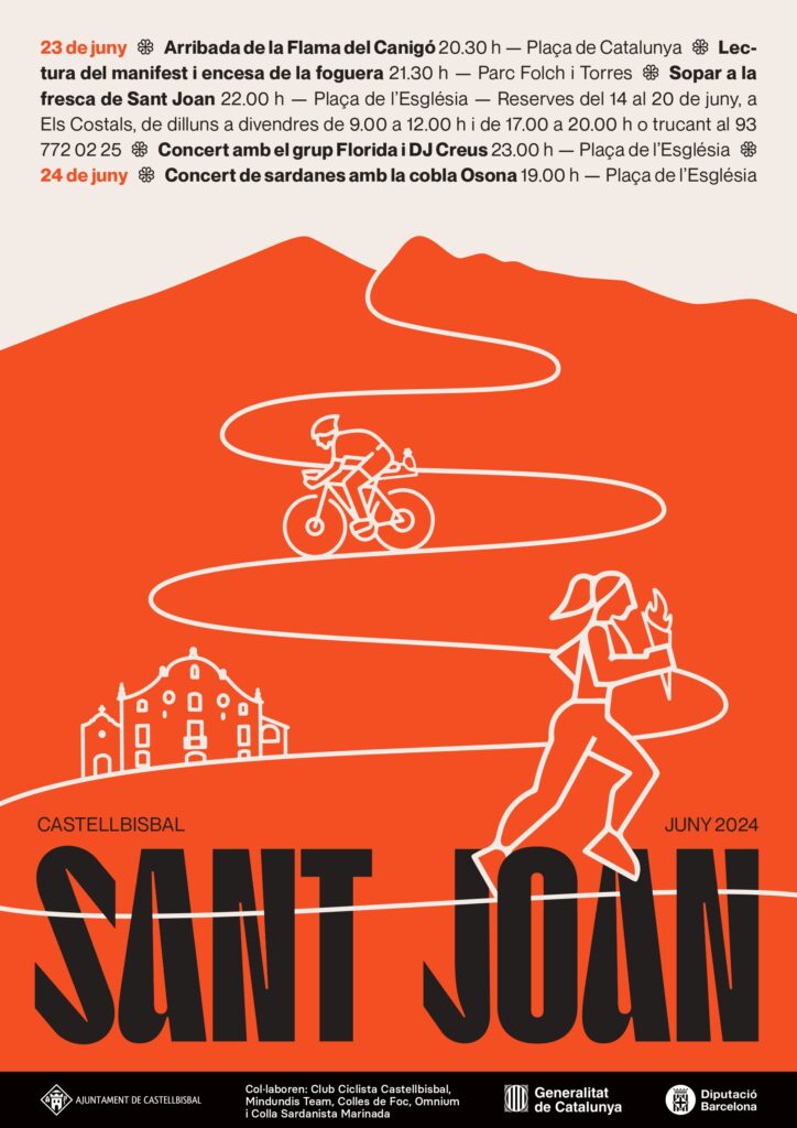 A partir de les 20.30 h arriba la Flama del Canigó a la Plaça Catalunya de la mà del Club Ciclista Castellbisbal! A les 21.30 h es farà al Parc Folch i Torres l’encesa de la foguera i la lectura del manifest, escrit per l’escriptora i periodista Núria Cadenes, en la qual Òmnium Cultural col·laborem, i que serà llegit pel filòleg Gerard Furest Dalmau. A les 22 h a la plaça de l’Església hi haurà el sopar a la fresca i revetlla amb el concert del grup Florida i el DJ Creus.