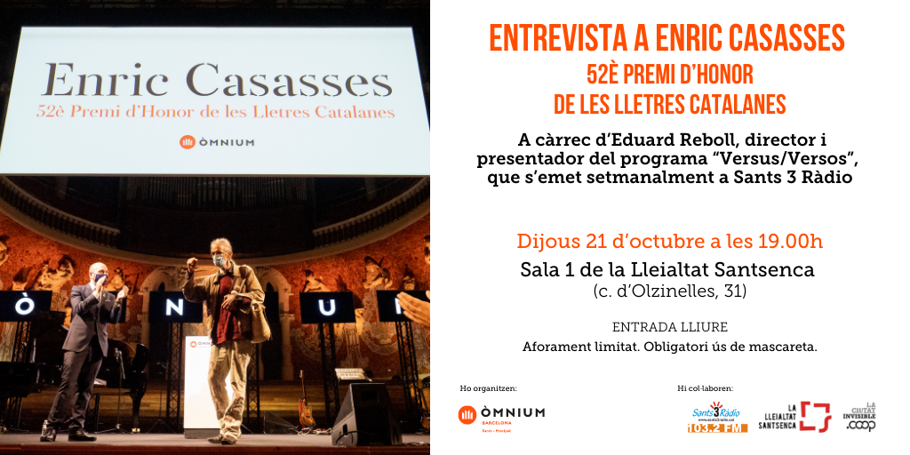 Òmnium Sants-Montjuïc, en col·laboració amb el programa radiofònic “Versus/Versos”, apropa al nostre barri un dels poetes que té una de les trajectòries artístiques i literàries més destacades del nostre país . La seva vàlua va ser reconeguda el 2020 amb el 52è Premi d’Honor de les Lletres Catalanes.