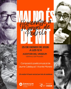 El duet format per Jaume Calatayud i Vicente Monera tornen a l’Auditori del Vinseum en un nou espectacle musical organitzat per Òmnium Alt Penedès, en aquesta ocasió per homenatjar a l’escriptor Manuel de Pedrolo. En acabar l’acte, els assistents podran gaudir d’un petit vermut a la terrassa del Vinseum.