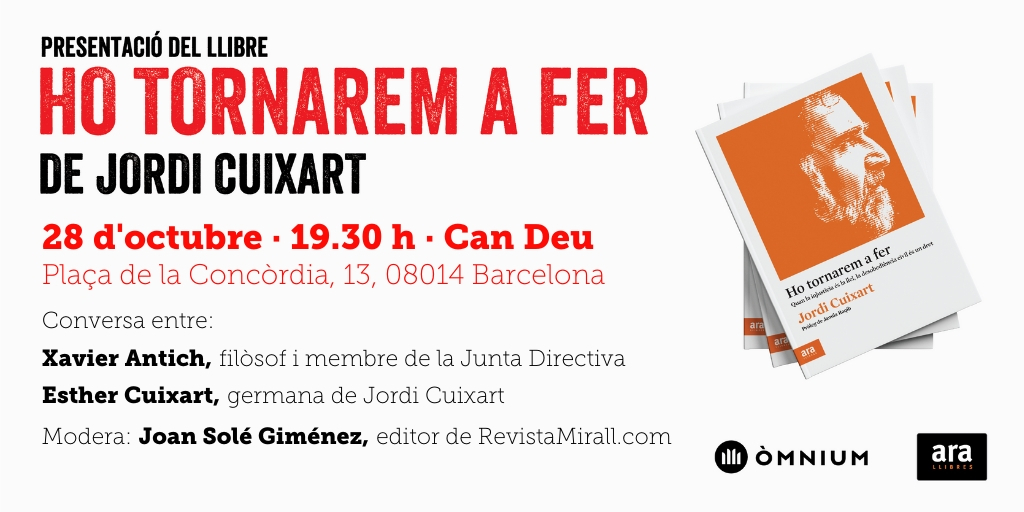 Òmnium Les Corts organitza al Centre Cívic Can Deu, dilluns 28 d’octubre a les 19.30 h, un acte en què Xavier Antich, filòsof i membre de la Junta Directiva d’Òmnium Cultural, conversarà amb Esther Cuixart, germana de Jordi Cuixart, sobre el llibre del president de l’entitat. Presenta l’acte Joan Solé Giménez, editor de RevistaMirall.com. La llibreria El Gat Pelut portarà els llibres.