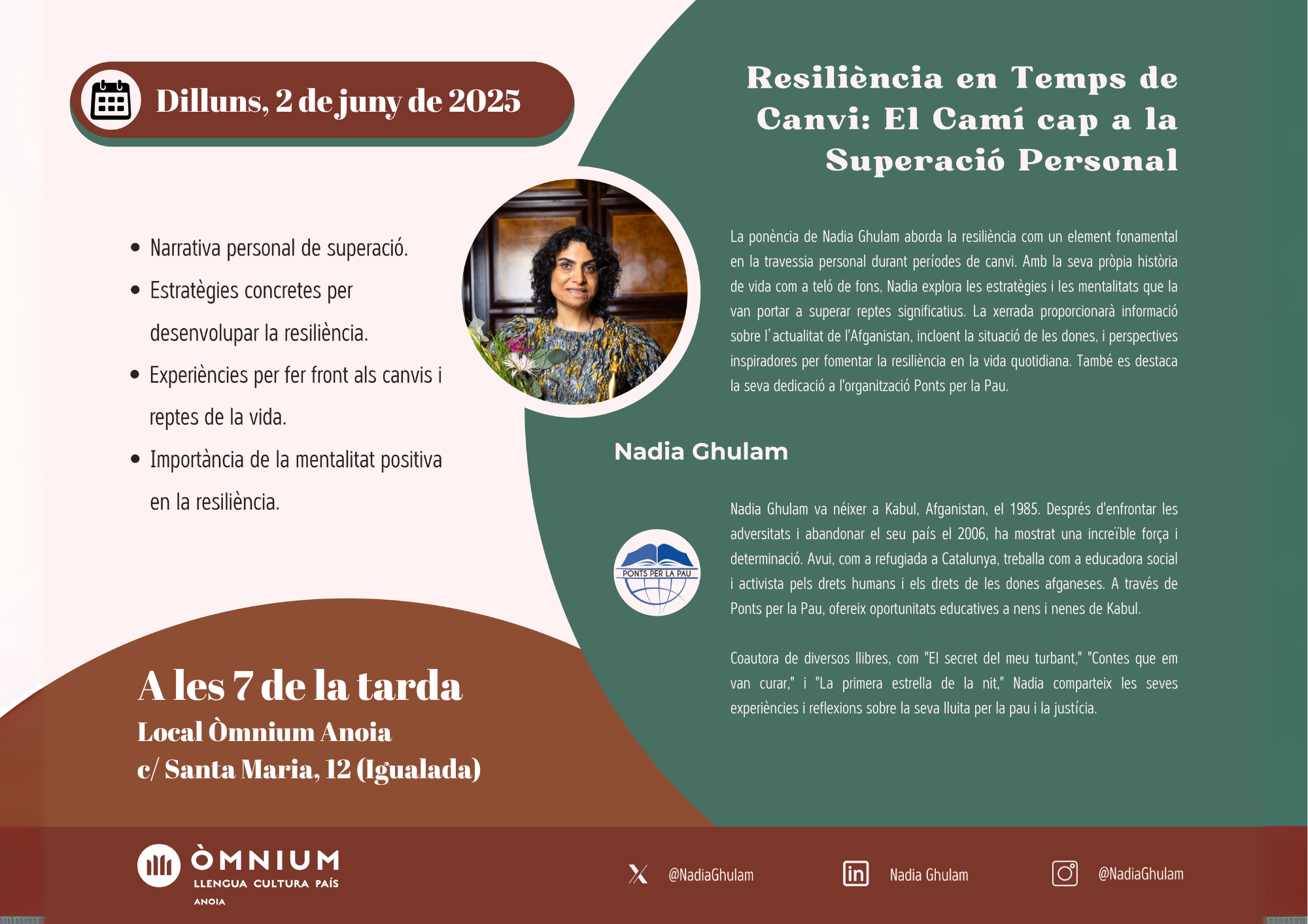 L’acte convida el públic a reflexionar sobre la capacitat humana de superar l’adversitat, adaptar-se al canvi i trobar força enmig de les dificultats. A través de la seva experiència vital, marcada per la guerra a l’Afganistan i la seva trajectòria com a refugiada a Catalunya, Nadia Ghulam compartirà un missatge de superació, pau i esperança.