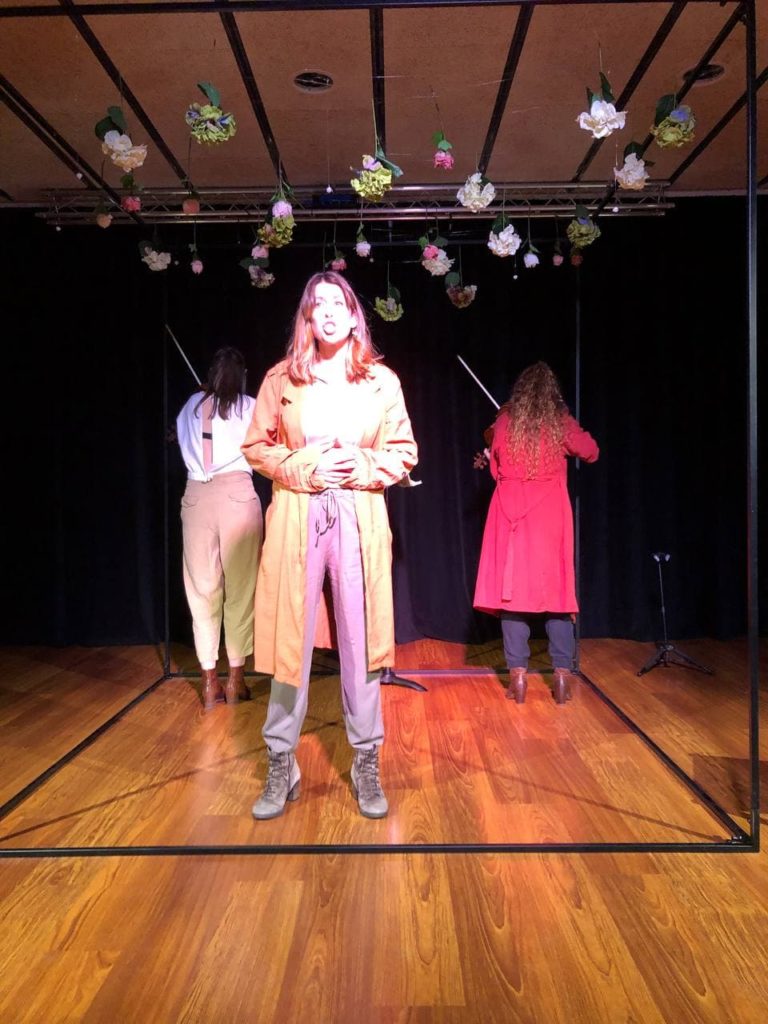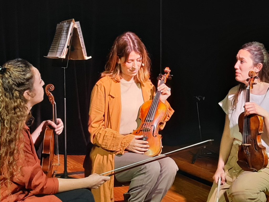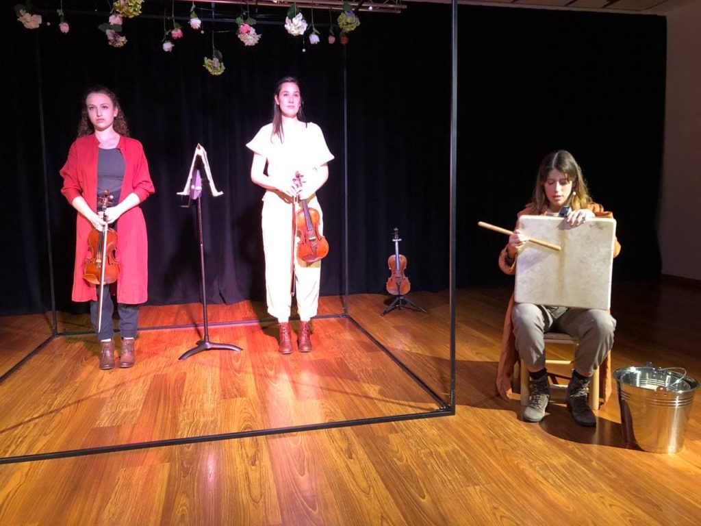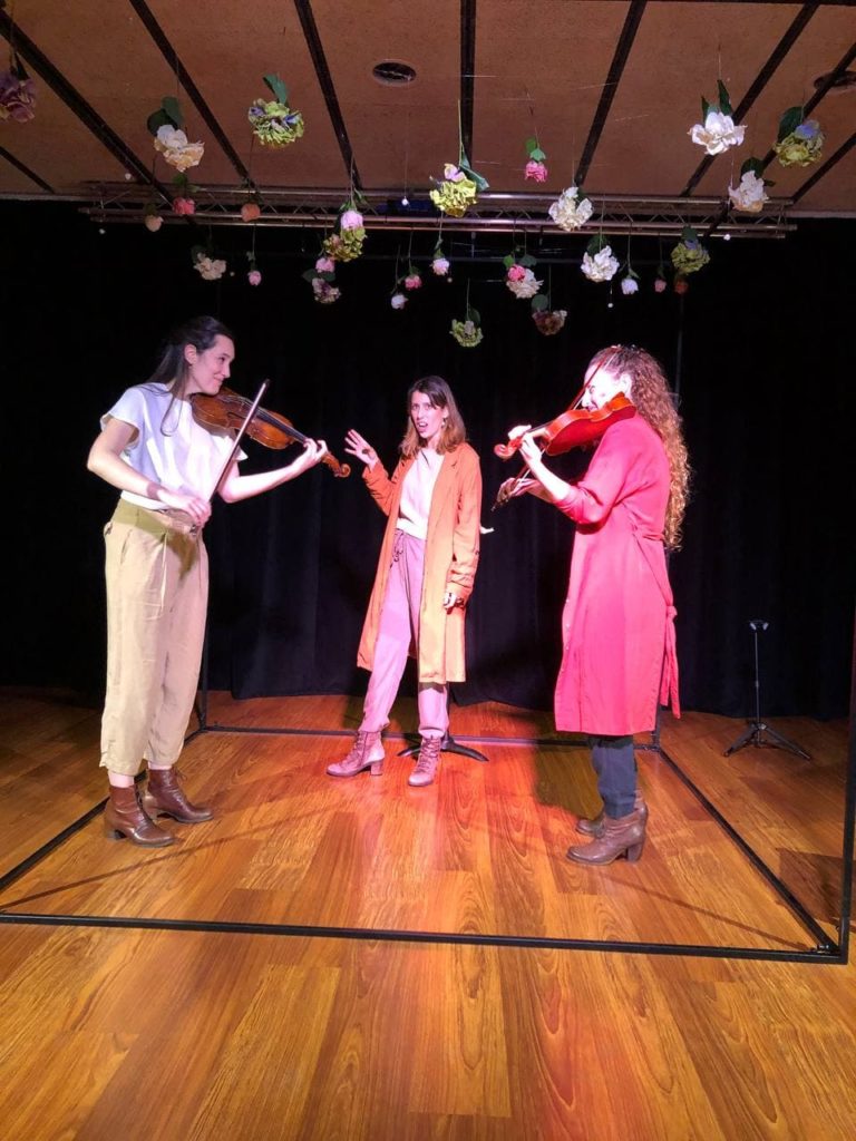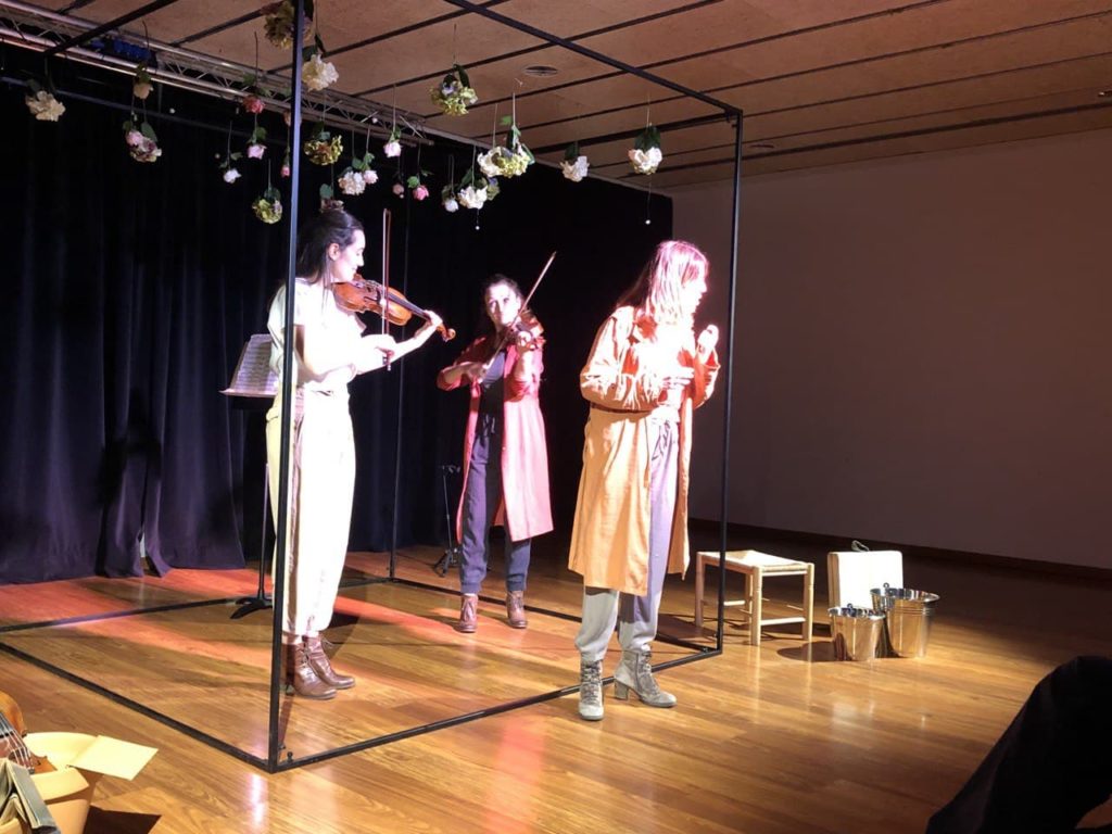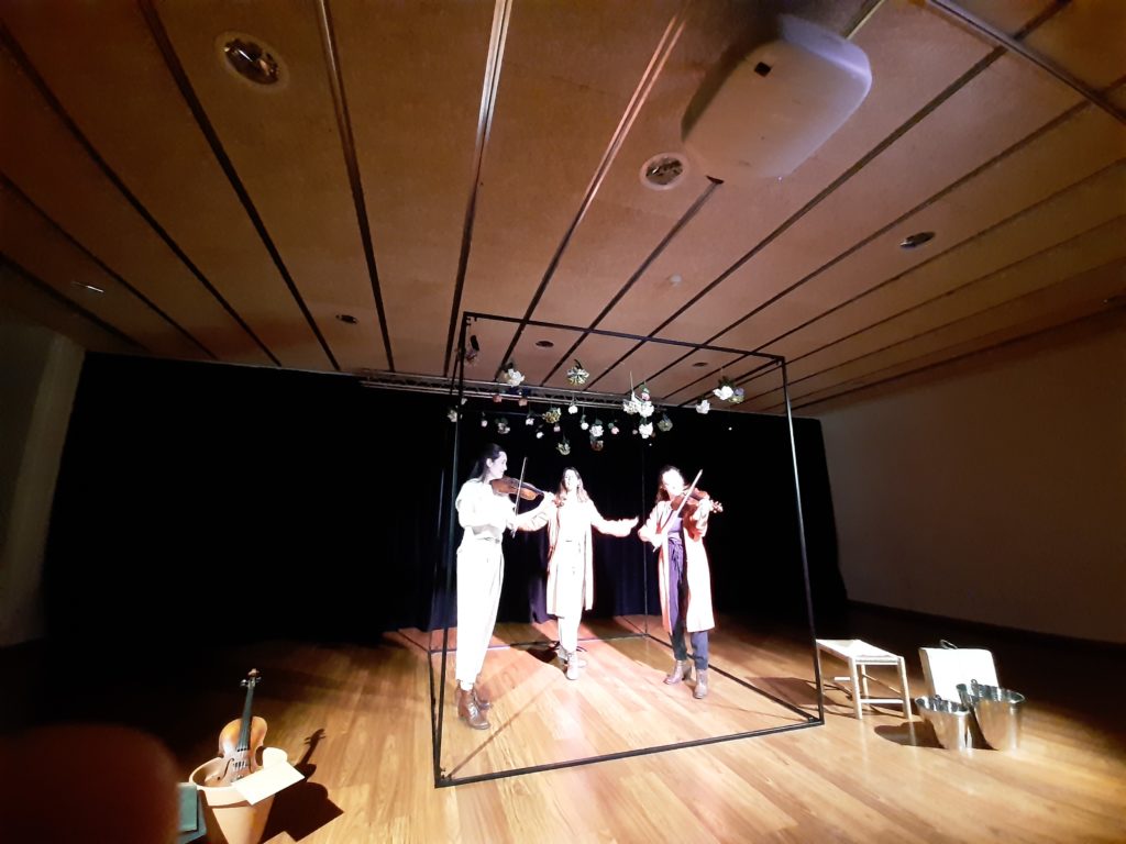 L’escenari era un jardí ple de simbolisme: un sostre de flors i petites poncelles penjant que al final van esdevenir cuques de llum, un faristol amb partitures dotat de moviment escenogràfic, testos amb llibres, galledes de llautó brillant plenes d’aigua clara. El moviment delicat de Mireia Vila, Olga Truman i Marta Codina ens va agombolar mentre contemplàvem les flors: la sense nom, la màgica, la vermella, la de foc, la flor morta… I elles jugaven enllaçant les mans dels arquets, amb les paraules i els pizzicatos.
