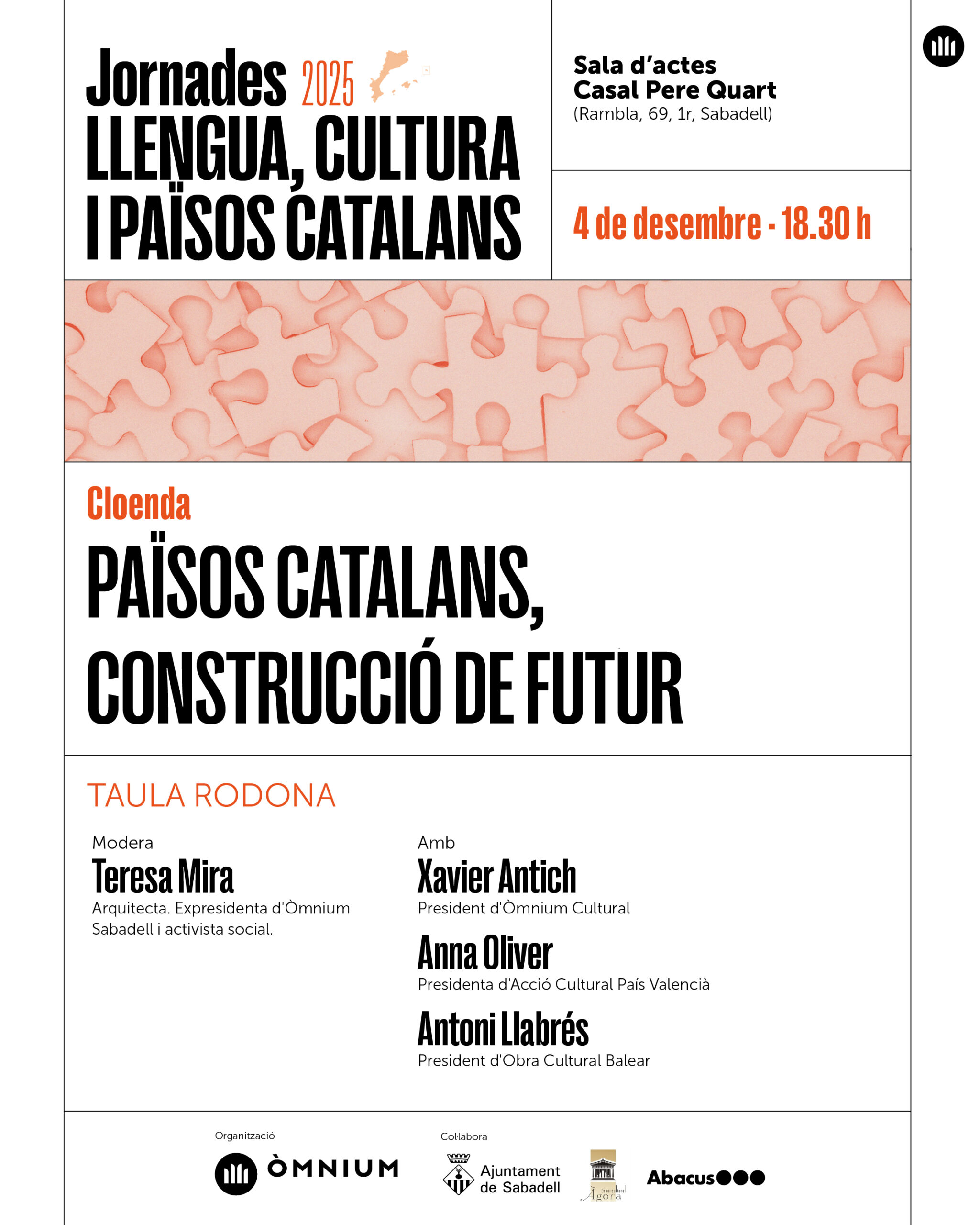 Dijous 4 de desembre a les 18:30 h al Casal Pere Quart (Rambla, 69, 1r, Sabadell) tindrà lloc la sessió de cloenda de les Jornades 2025 amb una taula rodona que reuneix destacades veus del moviment cultural i social dels Països Catalans per abordar reptes i estratègies de futur.