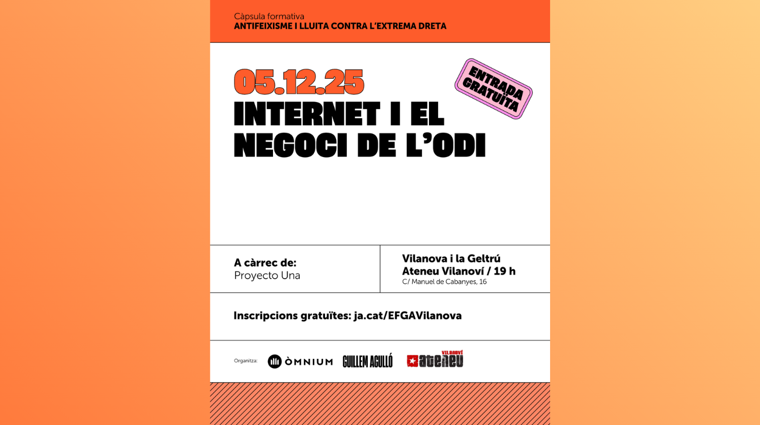 Òmnium Garraf i l’Ateneu Vilanoví organitzem una nova càpsula formativa per aprofundir en un dels grans reptes del nostre temps: l’impacte dels discursos d’odi a les xarxes socials i la capacitat de l’extrema dreta per propagar desinformació i narratives de conflicte. La càpsula porta per títol “Internet i el negoci de l’odi” i tindrà lloc a l’Ateneu Vilanoví el proper divendres, 5 de desembre.