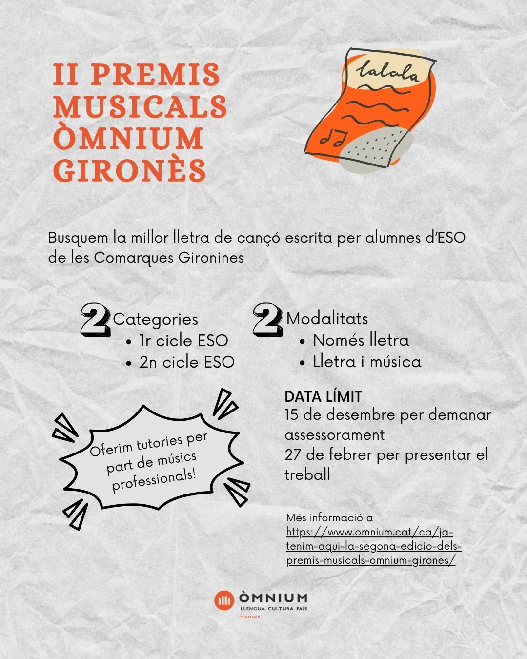 Òmnium Gironès convoquem els II Premis Musicals Òmnium Gironès que tenen per objectiu la promoció de l’ús literari i musical del català als centres educatius de les comarques gironines ja que uneix els dos mons.