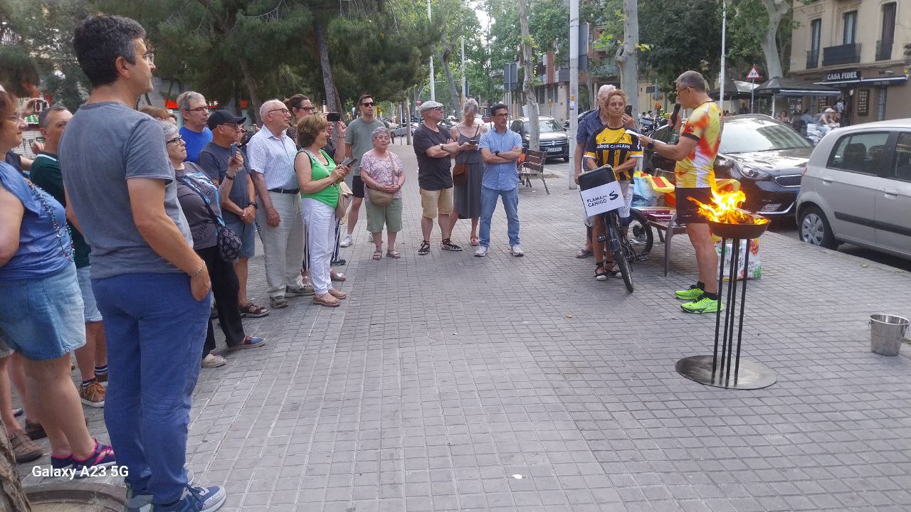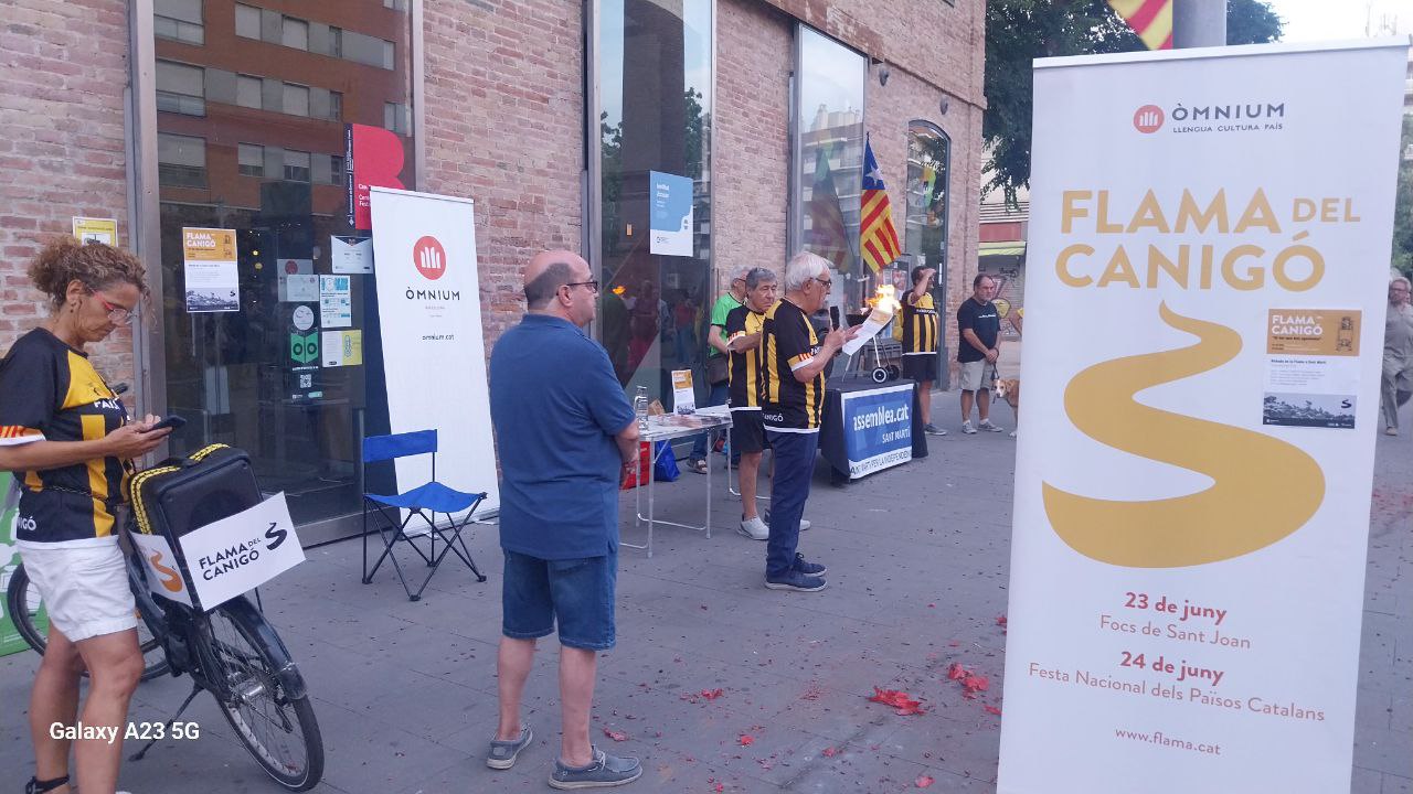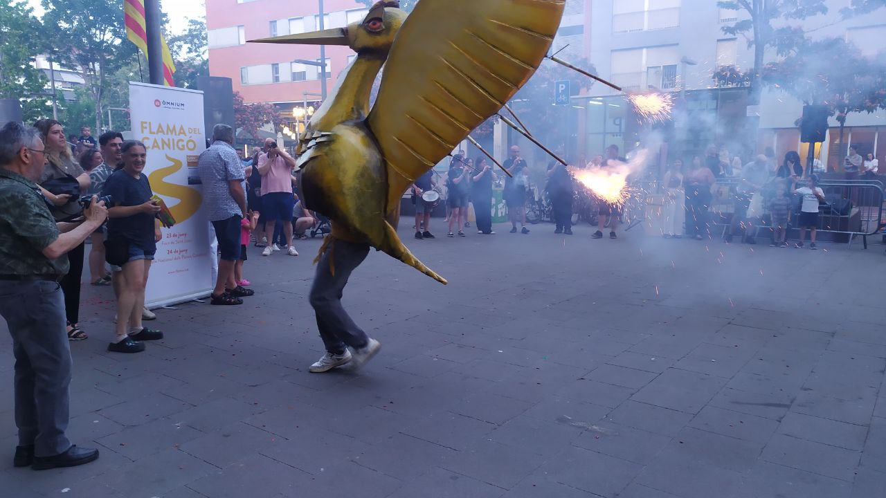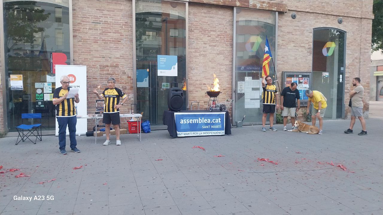 El dia 23 Òmnium Sant Martí va portar la Flama des de la Plaça de Sant Jaume fins a Can Saladrigas. Per entremig va encendre fogueres i peveters a diversos punts del districte. Al final, després d’encendre el peveter i de llegir el Manifest vam esperar la sortida de l’Au Fènix, que va ballar amb el foc sortit de la Flama. Finalment la corrua de la Colla del Drac va portar la Flama a la foguera que havien organitzat a la cruïlla Ramon Turró-Espronceda.