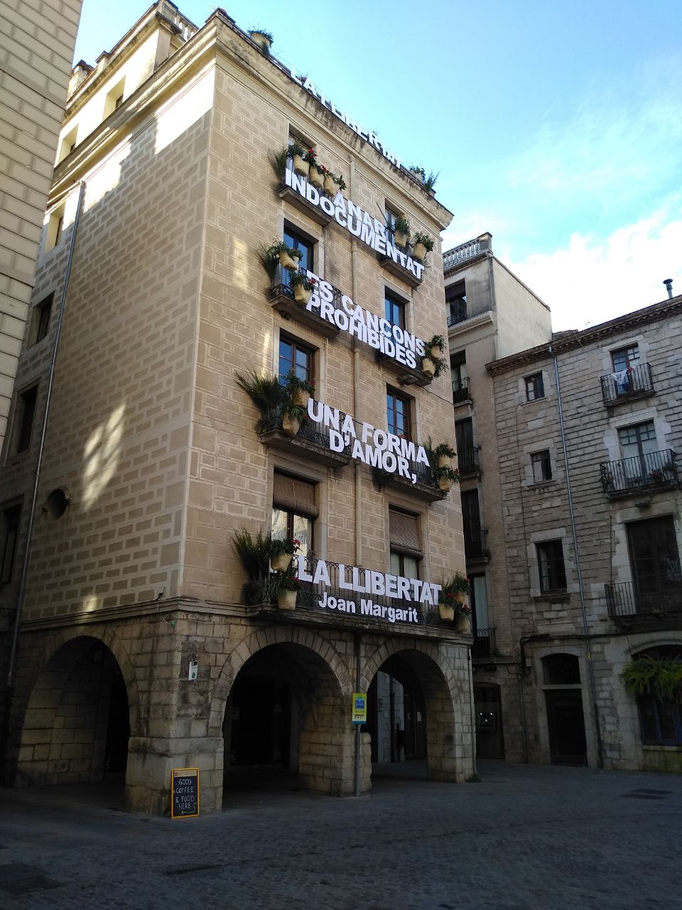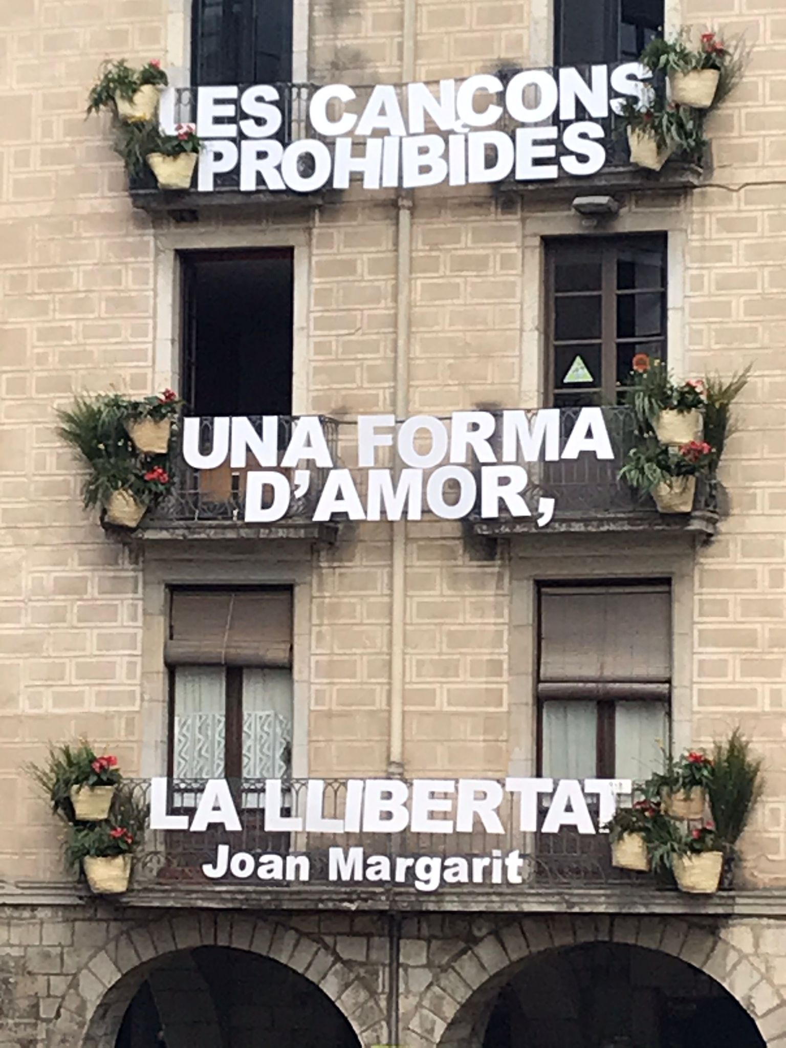 S’ha escollit un fragment del seu poema “La llibertat”, que s’ha col·locat a la façana i s’ha completat amb cabassos amb flors, eucaliptus, ginesta i altres plantes. Òmnium Gironès vol agrair als voluntaris i voluntàries que han fet possible el muntatge.
