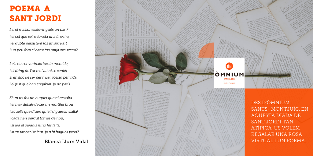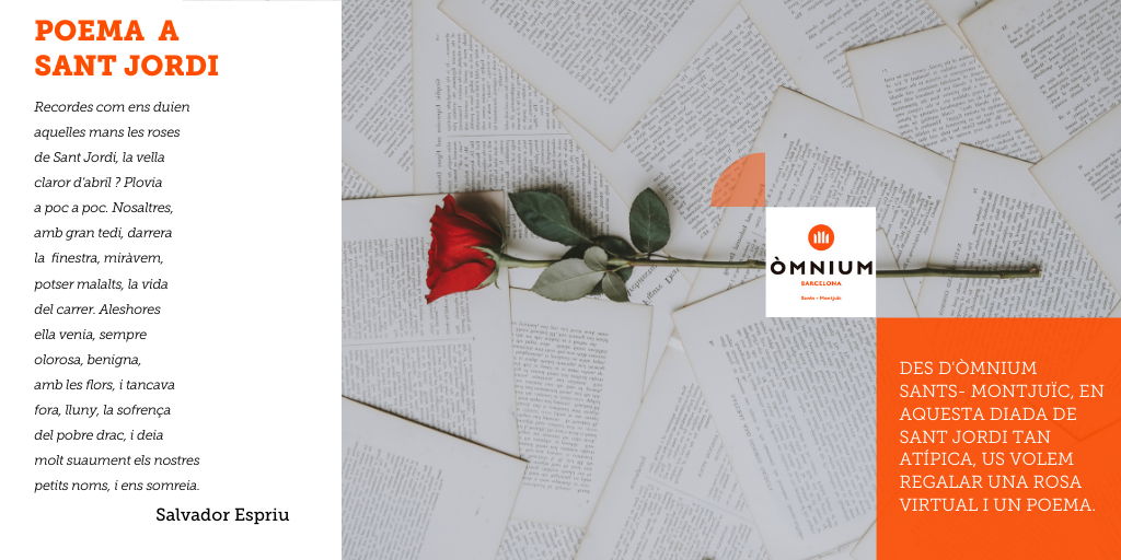 Des d’Òmnium Sants- Montjuïc, en aquesta diada de Sant Jordi tan atípica, us volem regalar una rosa virtual i un poema.
