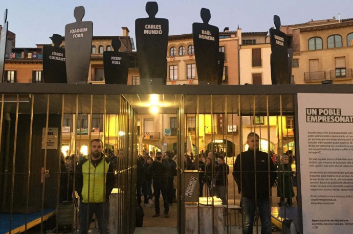 Aquesta instal·lació simula dues cel·les d’empresonament com les que poden estar els nostres representants. Fem una crida a tothom que estigui en contra de l’empresonament dels nostres polítics a què s’apunti a un dels torns per fer possible que la presó estigui ocupada per voluntaris/es que vulguin passar-hi una estona en solidaritat amb els presos i fer palesa la no normalitat que suposa l’existència de presos polítics a l’Europa del segle XXI.