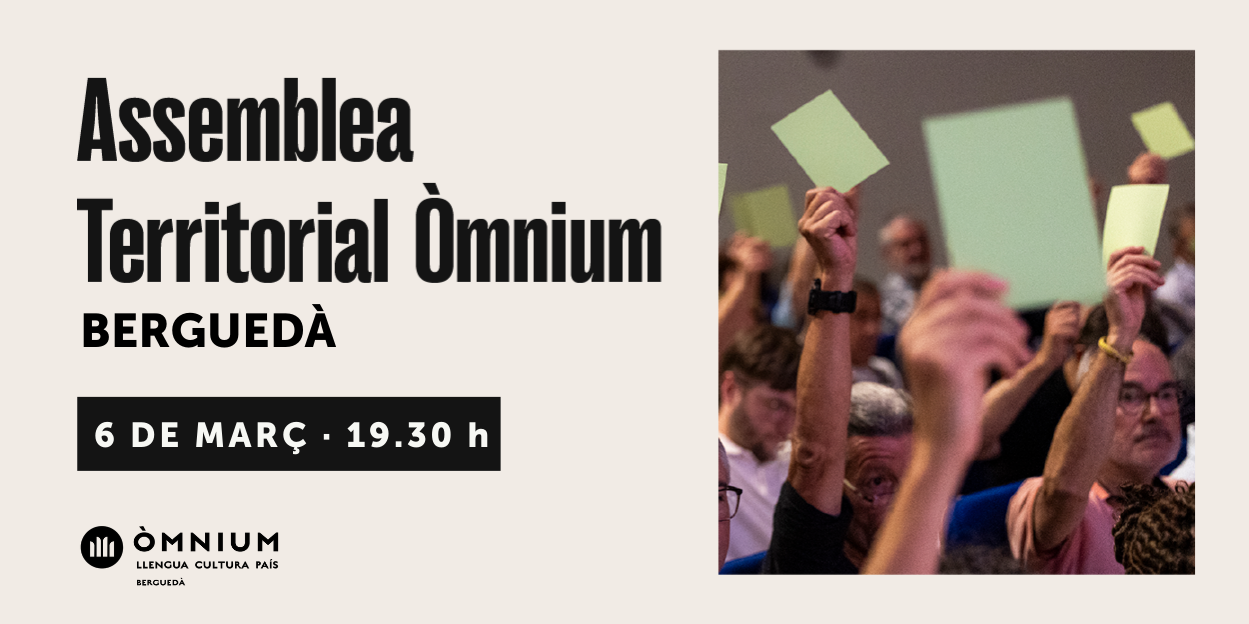 Òmnium Cultural Berguedà celebrarà la seva Assemblea General de Socis el pròxim dijous 6 de març, a partir de les 19.30 h, a la sala d’exposicions de l’Ateneu d’Avià. L’entitat fa una crida a tots els seus socis i sòcies perquè hi participin activament i puguin dir la seva sobre la feina feta durant el 2025 i els projectes i actes previstos per a aquest 2026 que tot just acaba de començar.